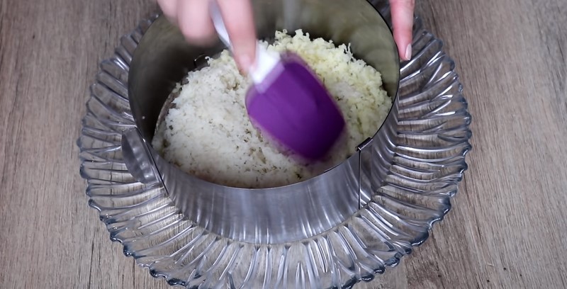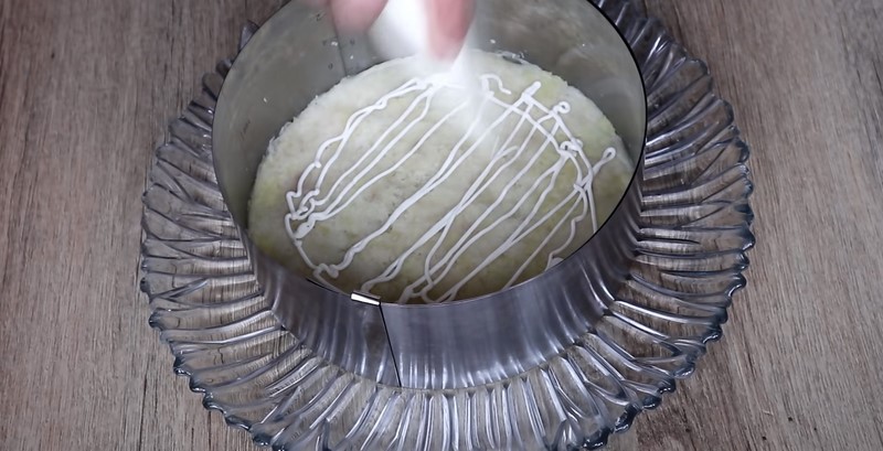3. Przygotuj przezroczystą miskę (najlepiej będzie w niej widać warstwy) i ułóż w niej najpierw ziemniaki, ugnieć i lekko posól. Następnie posmaruj majonezem.