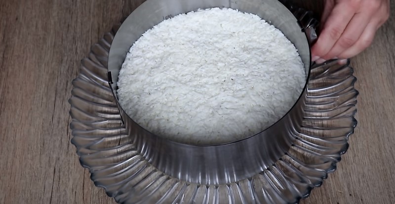 5. Czas na warstwy żółtek i mięsa z kurczaka. Ugnieć i wygładź, a gotową warstwę mięsa posmaruj majonezem. Następnie rozprowadź na wierzchu warstwę z białek i posyp wszystko startym serem. Sałatkę należy umieścić w lodówce na 1-2 godziny, żeby stężała.