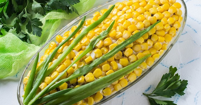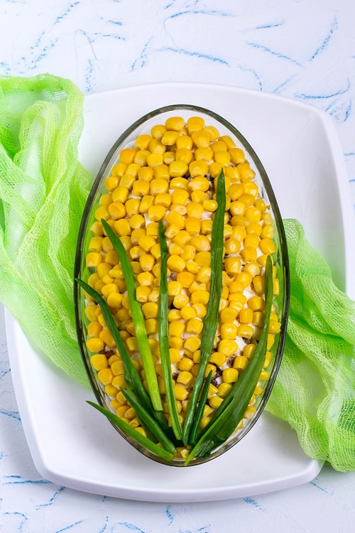 Jeżeli chcesz, możesz udekorować tę sałatkę w atrakcyjny sposób, który niewątpliwie przyciągnie uwagę gości. Na wygładzonej powierzchni ułóż równo pozostałe ziarenka kukurydzy z puszki – im większe, tym szybciej i efektowniej udekorujesz sałatkę). Na jednym końcu pojemnika połóż niewielką ilość szczypiorku, imitującego liście kukurydzy. Z pewnością zaskoczysz gości takim wyglądem sałatki, a jej smak przypadnie do gustu każdemu.