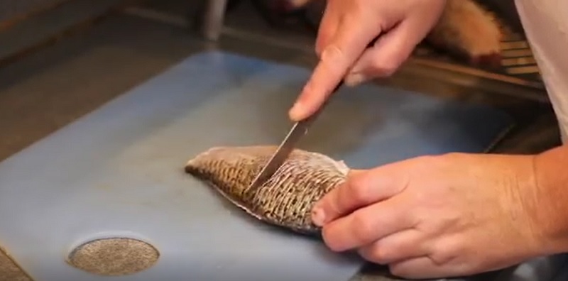 Ostrym nożem zrobić poprzeczne nacięcia (głębokość 3-4 mm) z każdej strony ryby. Karpia można pokroić na kilka części. Pamiętaj o nieprzecinaniu kręgosłupa.