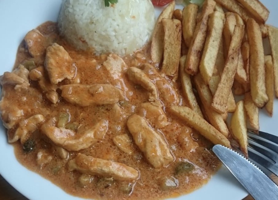 Tak przygotowane ogórki wrzuć do garnka. Dodaj śmietanę słodką i śmietanę. Dokładnie wymieszaj. Usmaż kawałki piersi z kurczaka na odrobinie rozgrzanego oleju.