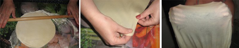 2. Po tym czasie, każdą część ciasta rozciągnij palcami możliwie najcieniej. Jeśli ciasto się rozerwie, nic straconego. Podczas zawijania farszu, wszystko się sklei.