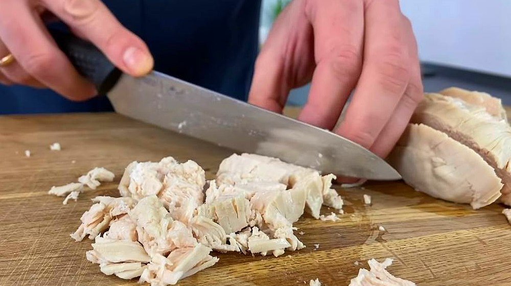 1. Filet z kurczaka oczyść i gotuj w wodzie ze szczyptą soli około 30 minut. Pozostaw do wystygnięcia, a następnie pokrój go w kostkę.