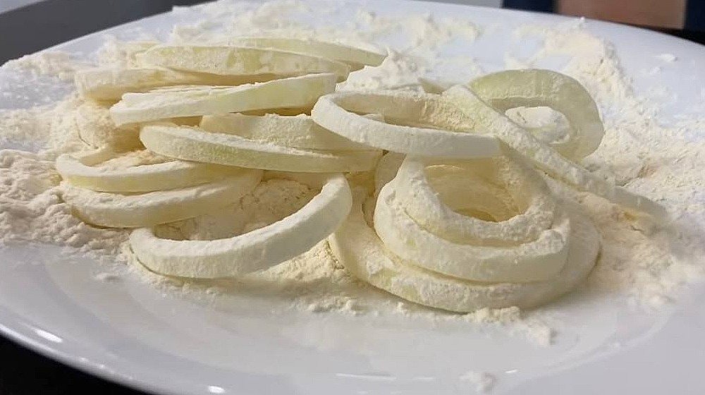 2. Pokrojone mięso przełóż do miski. Dodaj sos sojowy i wymieszaj. Odstaw na 15 minut, aby kurczak nabrał smaku. W tym czasie przygotuj krążki cebulowe. Cebulę obierz, pokrój w krążki i obtocz je mąką.