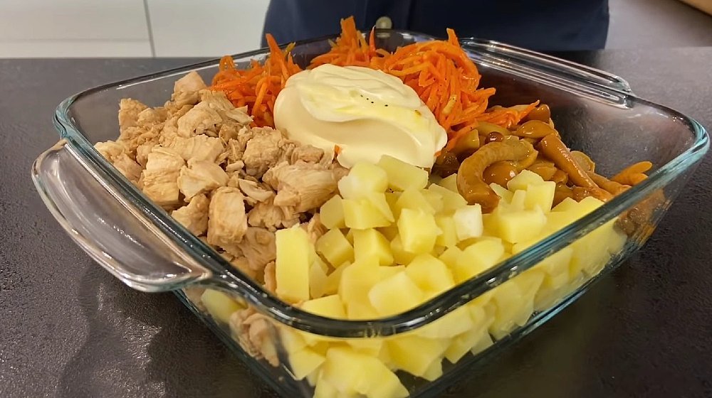 5. Połącz w misce przygotowane wcześniej składniki – ziemniaki, kurczaka, grzyby oraz marchewkę koreańską. Dodaj majonez i dopraw solą. Wymieszaj dokładnie. Gotowe!
