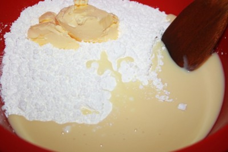 Do miski wsypujemy skrobię kukurydzianą, wlewamy całe słodzone mleko skondensowane i dodajemy pokrojone na małe kawałeczki masło.