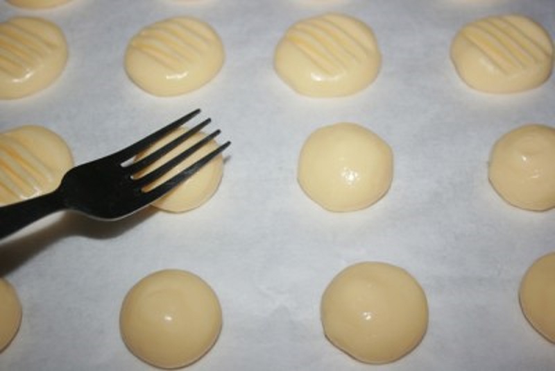 Dużą blachę do pieczenia (z wyposażenia piekarnika) wykładamy papierem do pieczenia. Odrywamy kawałki ciasta i formujemy z nich małe kulki wielkości orzecha włoskiego.