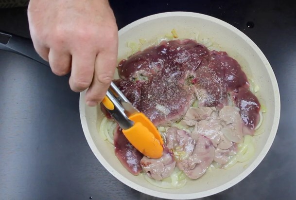 Krok 5: Gdy cebula będzie przyrumieniona i stanie się miękka, ułóż na niej pokrojoną w większe kawałki wątróbkę. Przypraw ją solą i pieprzem według własnych preferencji.