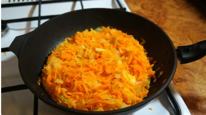 1. Na sam początek przygotuj po dwie cebule i marchewki. Obierz cebule i pokrój je w półpierścienie. Natomiast marchewki zetrzyj za pomocą tarki na dużych oczkach.