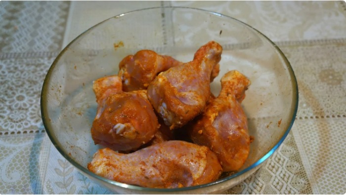 3. Około 8 udek przełóż do dużej miski i je przypraw jedną łyżeczką soli. Wsyp czarny, mielony pieprz i inne ulubione potrawy raz z przyprawą do kurczaka. Wlej odrobinę oleju, ponieważ dzięki temu przyprawy lepiej połączą się z mięsem. Przygotuj dwie szklanki ryżu. Opłucz je pod bieżącą wodą.