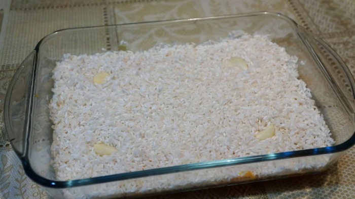 4. Przygotuj naczynie żaroodporne. Połóż na jego dno wcześniej usmażone warzywa, a następnie surowy ryż. Na patelni, gdzie wcześniej smażyłaś marchew oraz cebulę – wlej cztery szklanki wody. Po tym przypraw solą oraz pieprzem. Połóż na wyłożony ryż dwie ząbki czosnku, który został wcześniej pokrojony w plastry.