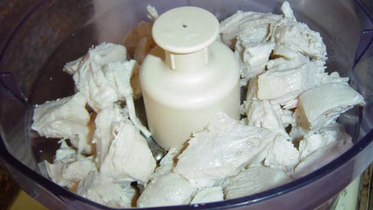 1. Filet z kurczaka umyj, oczyść i ugotuj do miękkości w osolonej wodzie. Potem go wystudź i pokrój na mniejsze kawałki.