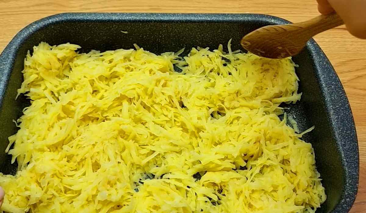 Włącz piekarnik na 180 stopni. Przygotuj naczynie do zapiekanki. Posmaruj tłuszczem, żeby zapiekanka nie przywarła do naczynia. Zetrzyj ser na grubych oczkach. Kolejno warstwami wykładaj najpierw ziemniaki, cebulę i wyłóż mięso.