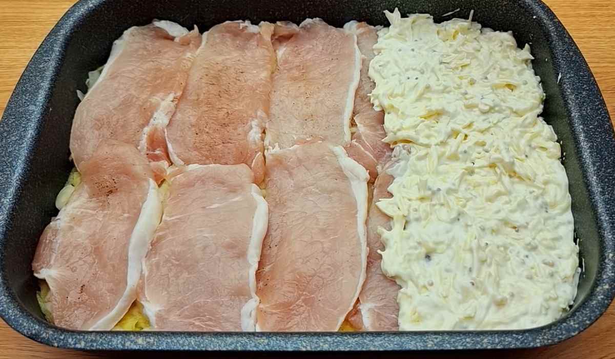Czas na przygotowanie sosu. Wymieszaj musztardę, majonez i jogurt. Dodaj starty ser. Tak powstały sos rozłóż równomiernie na mięsie do zapiekanki. Wstaw do piekarnika na około 20-30 minut. Pamiętaj, aby w pierwszej fazie pieczenia przykryć folią i papierem pergaminowym naczynie. To zapobiegnie zbytniemu przypieczeniu się góry.