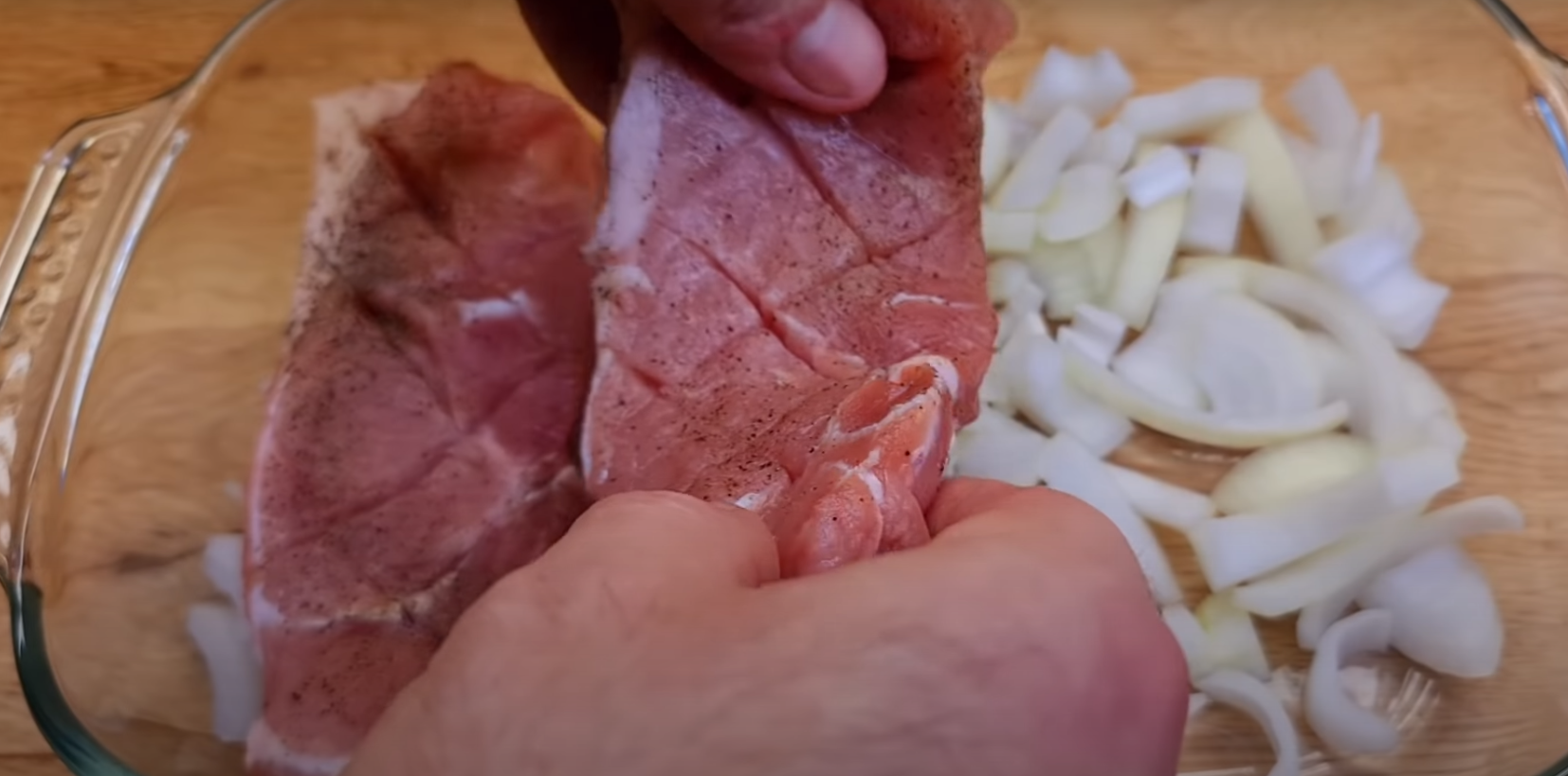 Przygotować naczynie żaroodporne. Cebulę obrać i pokroić w cienkie piórka, przełożyć do naczynia. Schab umyć i osuszyć, pokroić na cienkie plastry.