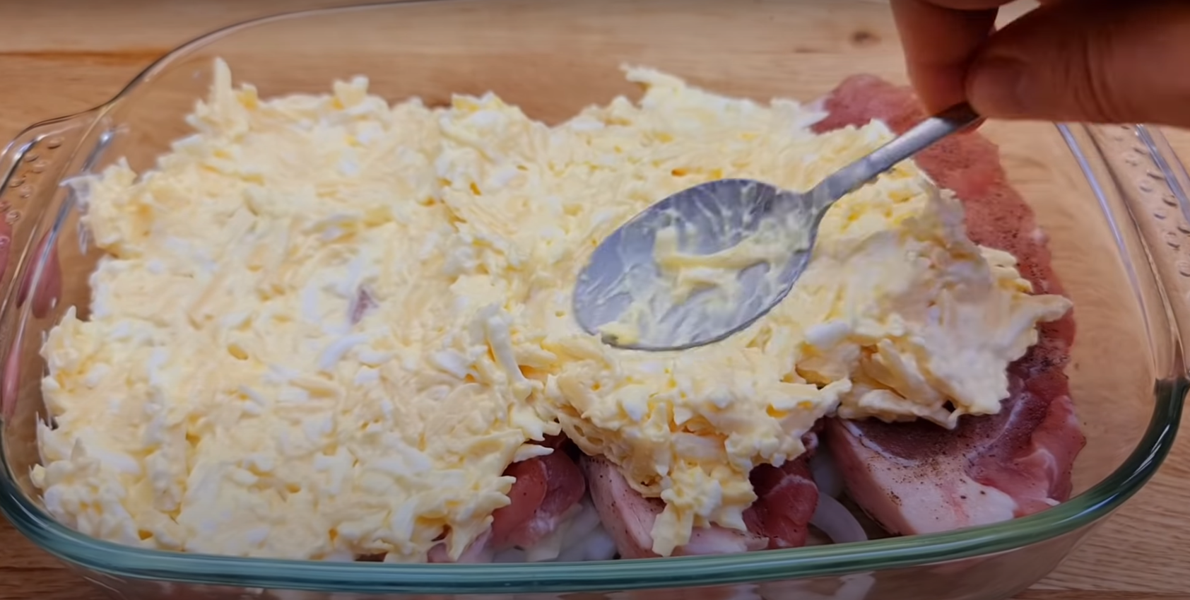 Położyć schab na cebuli. Przygotować sos. Ser oraz jajka zetrzeć na tarce o średnich oczkach, wrzucić do miseczki. Dodać majonez, sól oraz pieprz i dokładnie wymieszać. Tak przygotowany sos ułożyć na plastrach schabu.