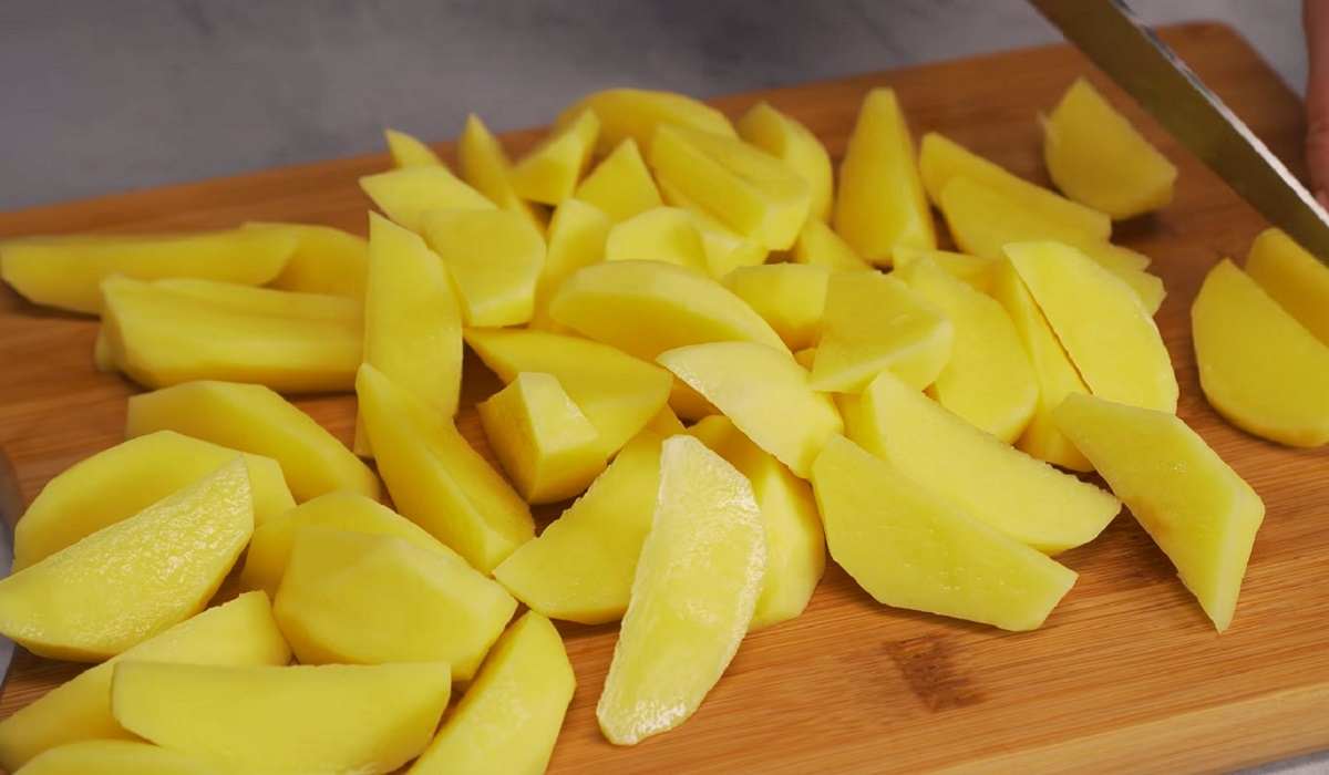 W kolejnym kroku obieramy i myjemy ziemniaki. Następnie kroimy je w kostkę i wkładamy do garnka i dolewamy tyle wody, aby zakryła ziemniaki.