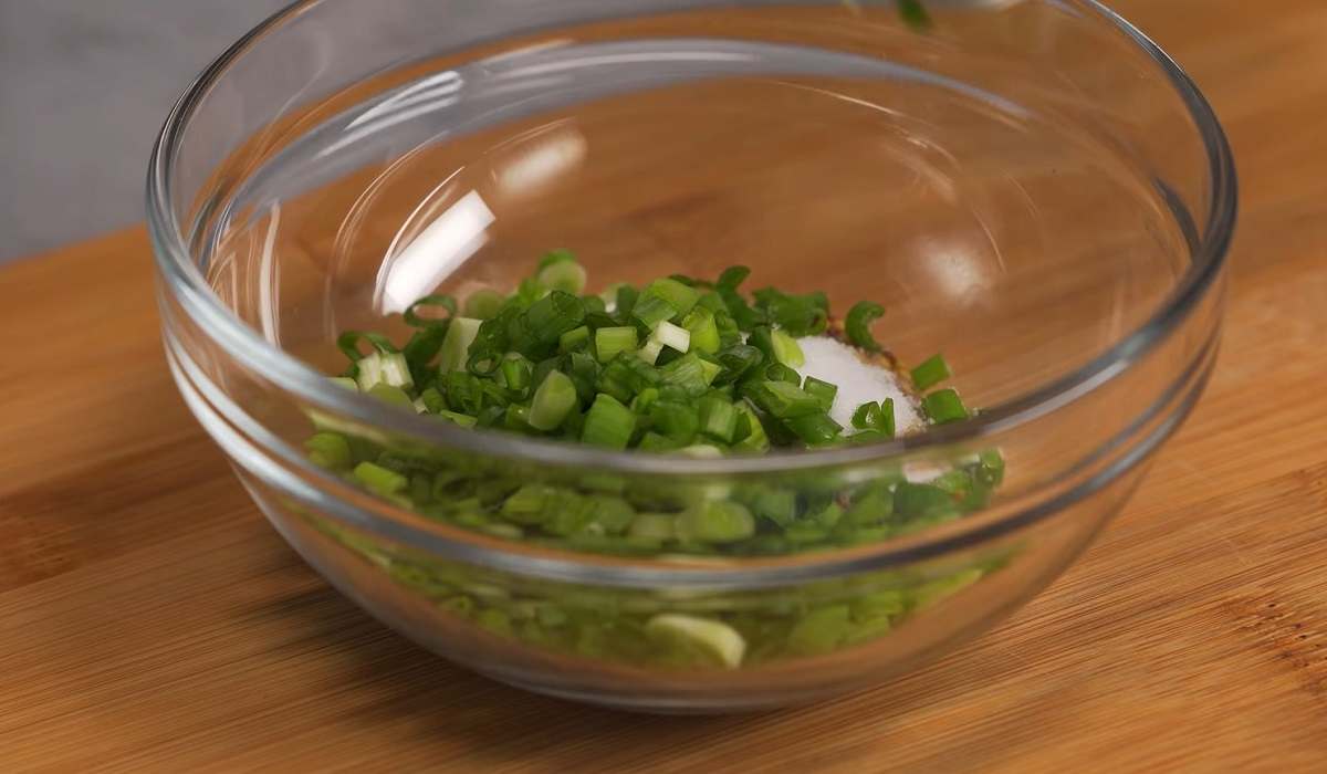 2 łyżki musztardy przekładamy do miski, następnie dodajemy kieliszek oliwy oraz 4 łyżki sosu. Potem drobno siekamy szczypiorek, który również wkładamy do miski. Wszystko solimy.
