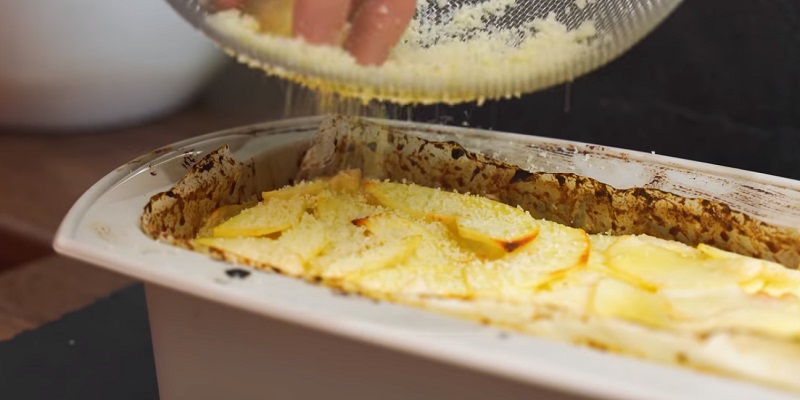 2. Prostokątną formę do ciasta smarujemy masłem i układamy na niej pergamin. Zanurzamy plastry owoców w cieście po obu stronach.